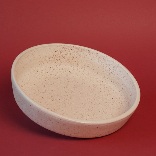 Each piece has its own character, from the irregularities in the object to the speckled glaze and the sponge marks underneath.