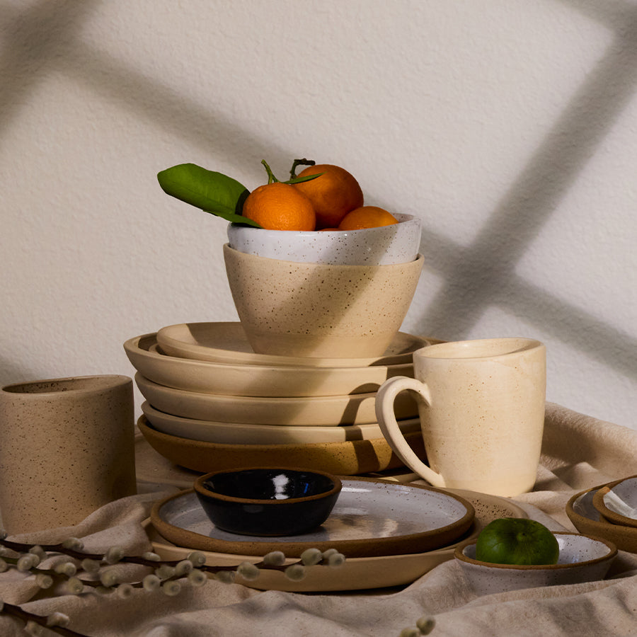 The raw clay underneath each piece maintains its sandy texture, while the glazed areas become smooth and glassy. The combination of two different textures results in functional pottery that's dishwasher-safe, microwave-safe, and a pleasure to hold.