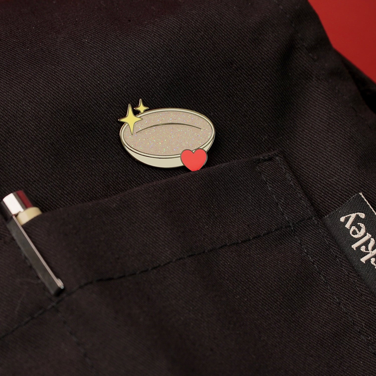 Each pin comes attached to a paper backer card for gifting. Remove the metal butterfly clasp to free the pin from its backer card, and attach the pin to a fabric apron, tote bag, or tee shirt.