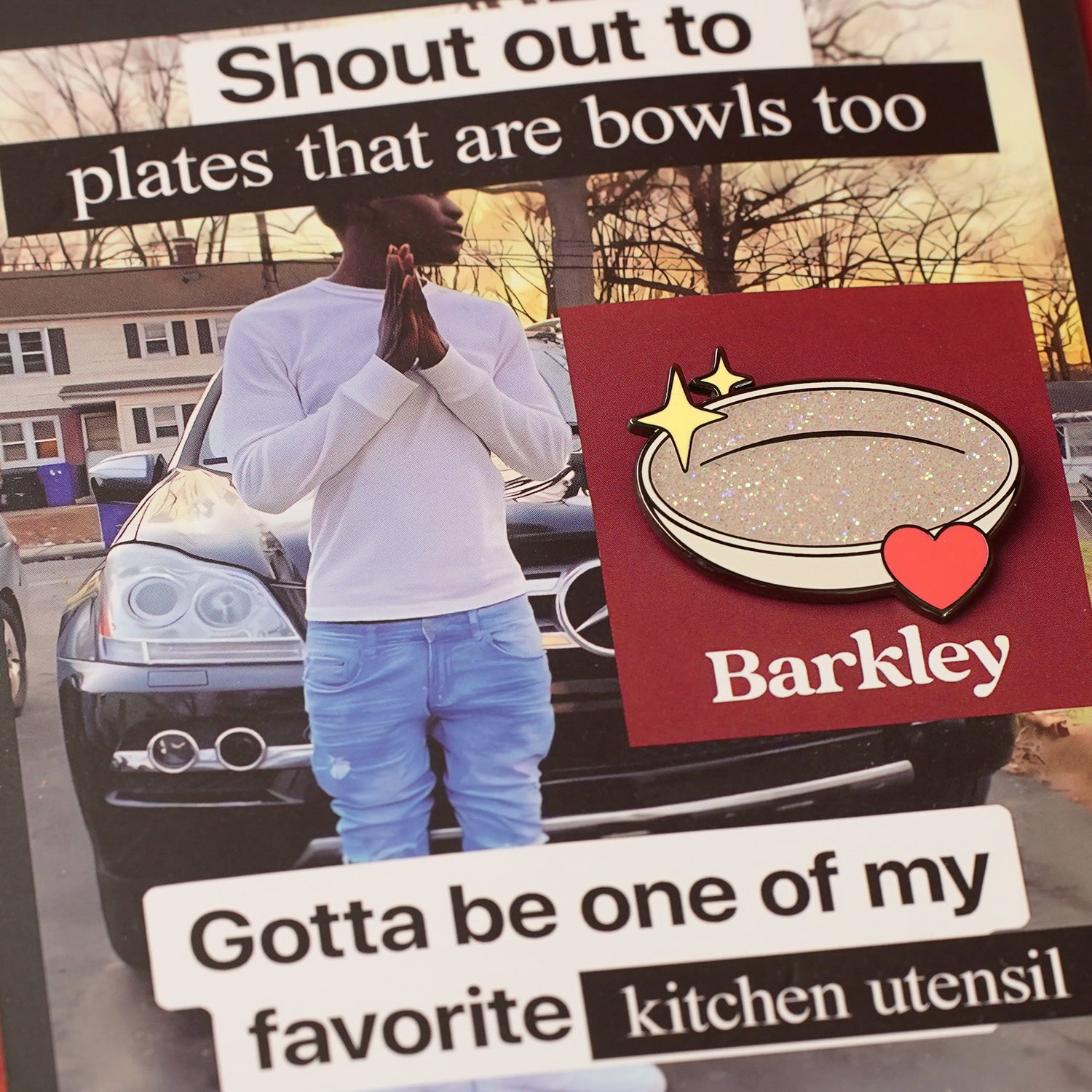 This pin is 1.25 inches across at its widest point. It's a hard enamel pin on black nickel with a metal butterfly clasp closure. Each pin is stamped with the Barkley logo on the back, attached to a backer card, then wrapped in a poly bag.